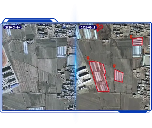 通过航拍图实时更新,图像大数据智能分析,对违规区域通过色块进行区分,帮助工作人员治理抢种、抢建、违建等违规现象。